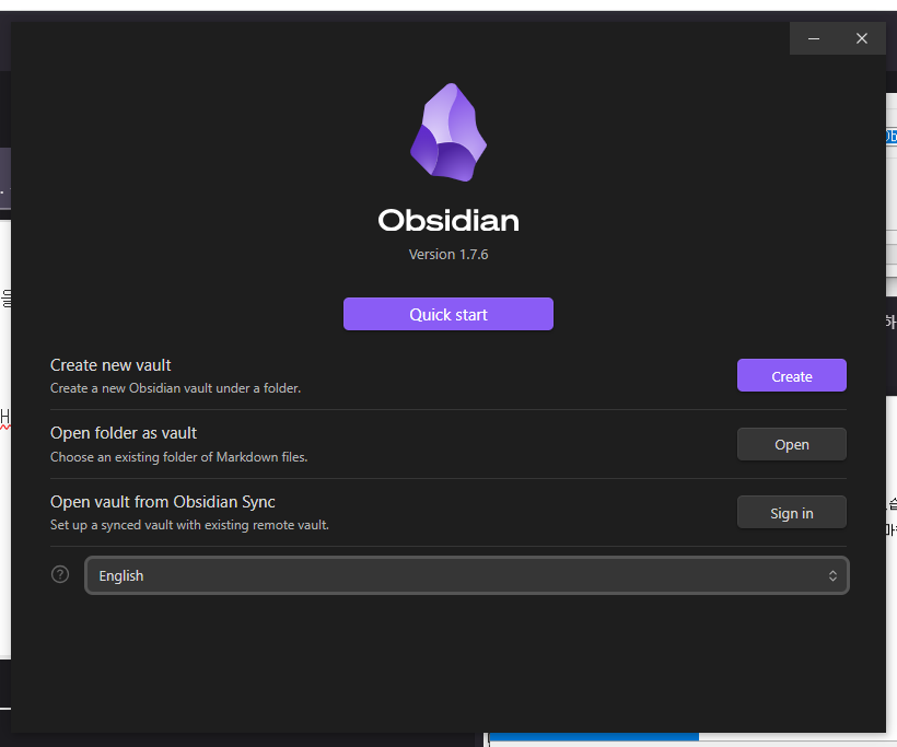 Create new vault는 그야 말로 새 볼트(데이터베이스)를 만드는 작업입니다. 어차피 마크다운이 많이 들어 있는 폴더 이ㅃ니다.