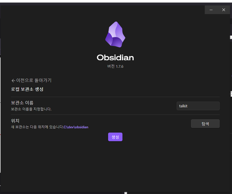 그리고 생성 버튼을 클릭해서 새 볼트를 만드십시오.