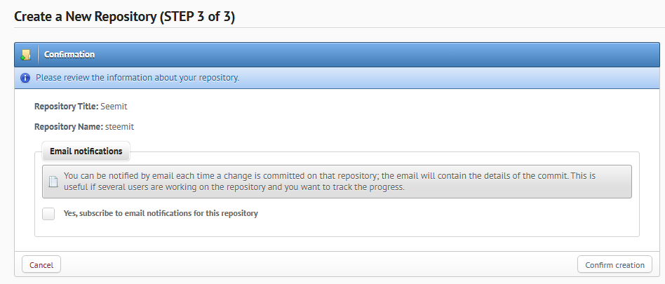 위 이미지에서는 이메일로 주요 정보를 전송할 것인가를 묻고 있습니다. 체크하고 Confirm creation을 클릭하십시오.