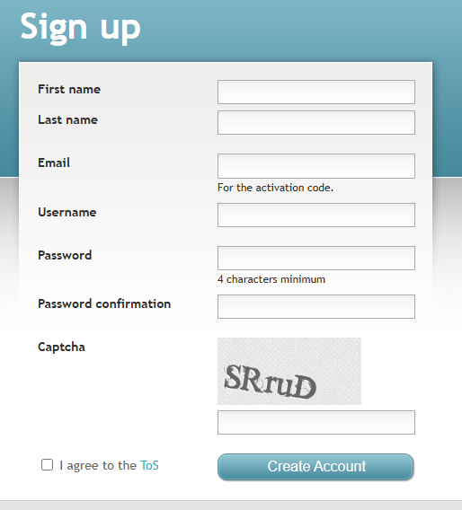 이름과 이메일 그리고 사용자아이디(username), 비밀번호2번, 캡차를 입력하시고, I agree to ToS(Terms of Service, 약관)을 체크하고 Create Account를 클릭 하면 끝입니다.